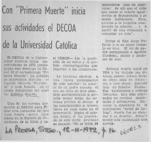 Con "Primera Muerte" inicia sus actividades el DECOA de la Universidad Católica [artículo]