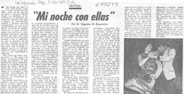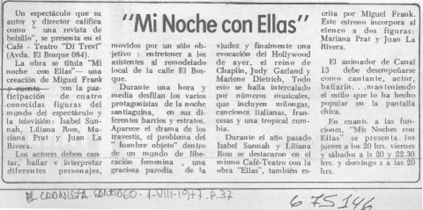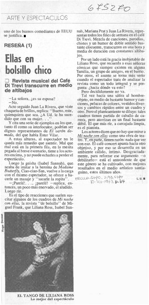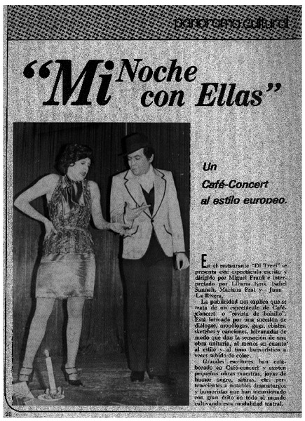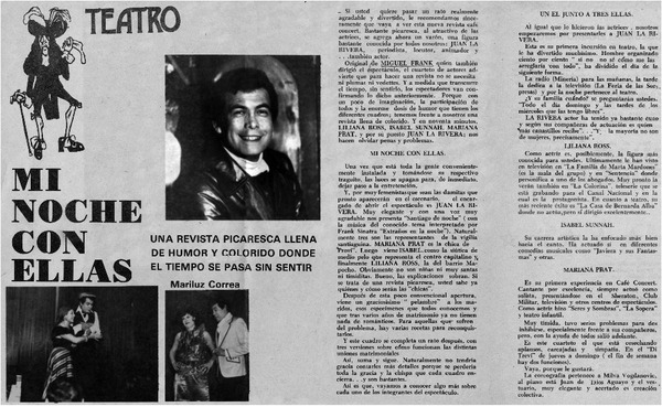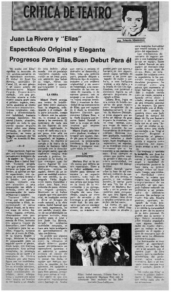 Juan La Rivera y "Ellas" espectáculo original y elegante progresos para ellas, buen debut para él [artículo] Yolanda Montecinos.