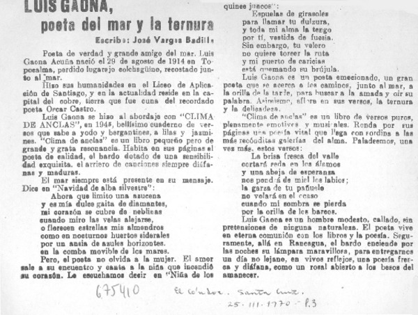 Luis Gaona, poeta del mar y la ternura [artículo] José Vargas Badilla.