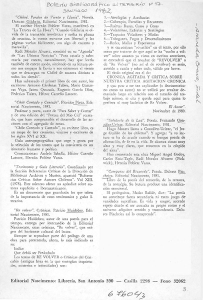 Autores chilenos - Lafourcade, Enrique - Pérez, Floridor - Pincheira, Dolores - Huidobro, Patricio - González-Urizar, Fernando - Gilchrist, Duncan - Chiloé, paraíso de viento y lluvia - Sabiduría de la luz - Re volver - Escriba sentado - Chile contado y cantado - Campanas del recuerdo