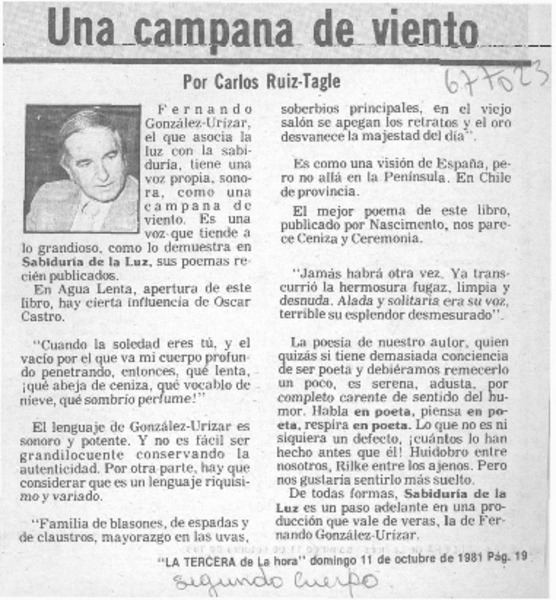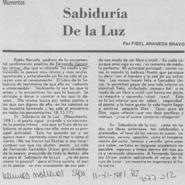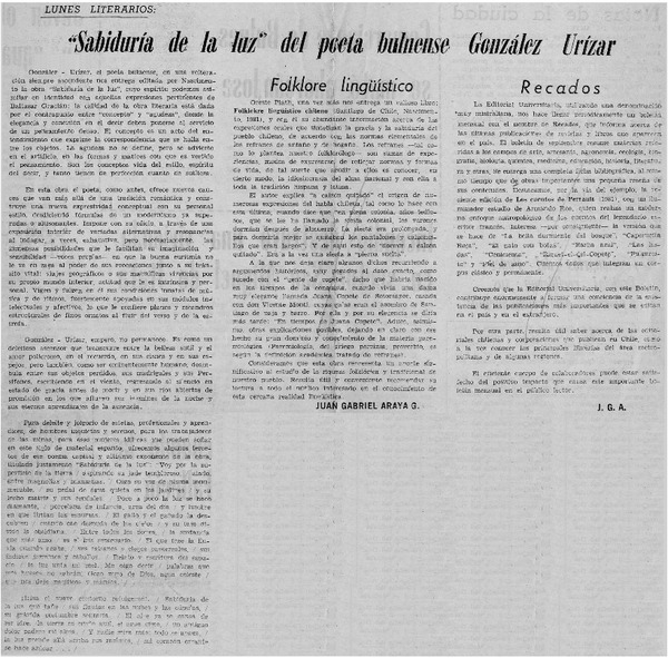 Sabiduría de la luz" del poeta bulnense González Urízar [artículo] Juan Gabriel Araya.