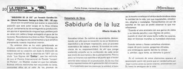 Sabiduría de la luz : [artículo] Alberto Arraño.