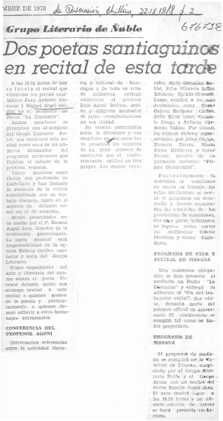 Dos poetas santiaguinos en recital de esta noche. [artículo]