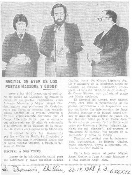 Recital de ayer de los poetas Massone y Godoy. [artículo]