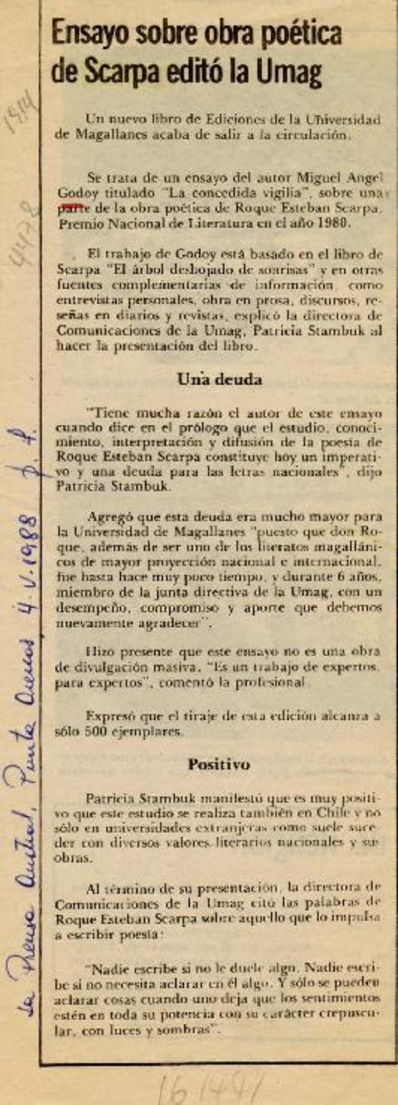 Ensayo sobre obra poética de Scarpa editó la Umag [artículo]