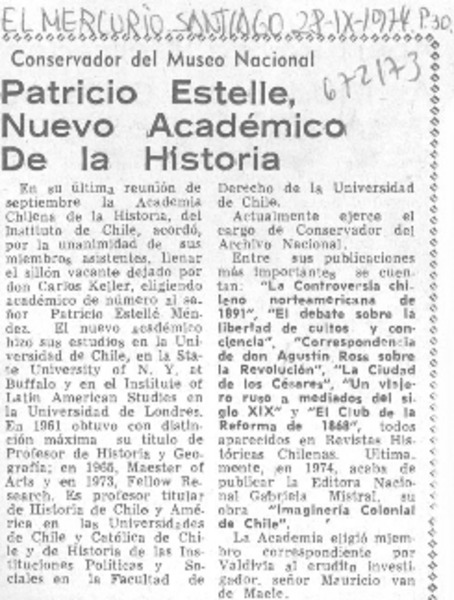 Patricio Estelle, nuevo académico de la historia. [artículo]