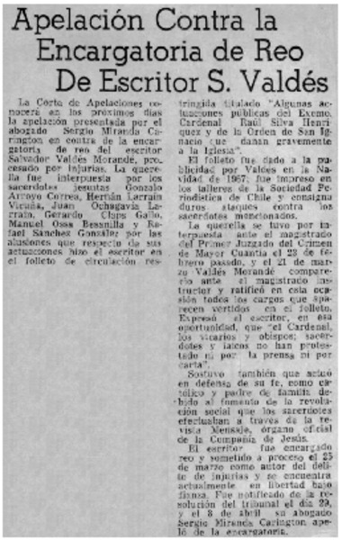 Apelación contra la encargatoria de reo de escritor S. Valdés. [artículo]