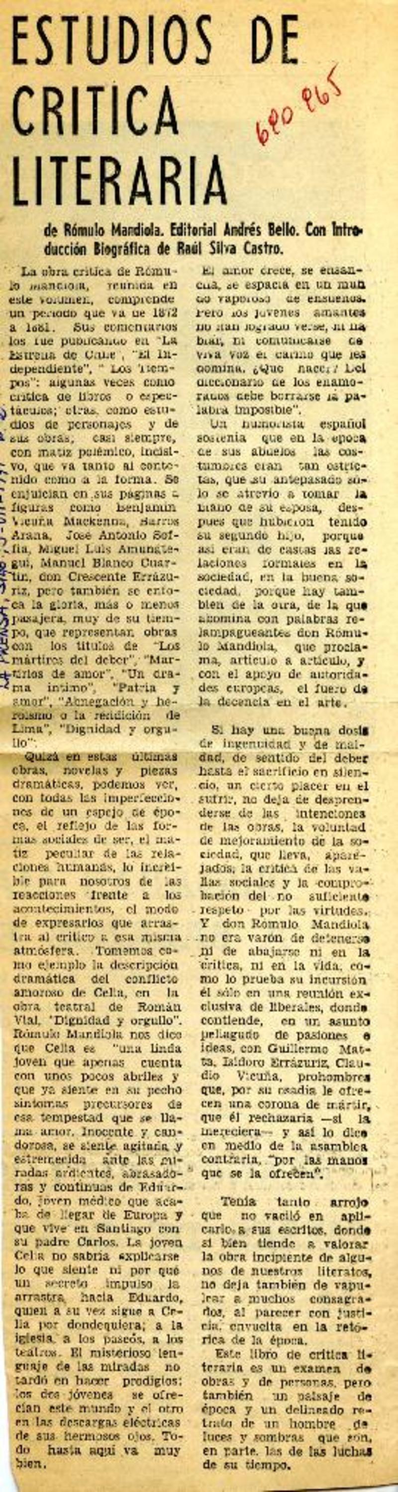 Autores chilenos - Mandiola, Rómulo - Estudios de crítica literaria
