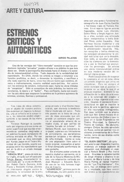 Ultimos estrenos de 1981: dos obras chilenas y un clásico [artículo] Manuel Peña Muñoz.