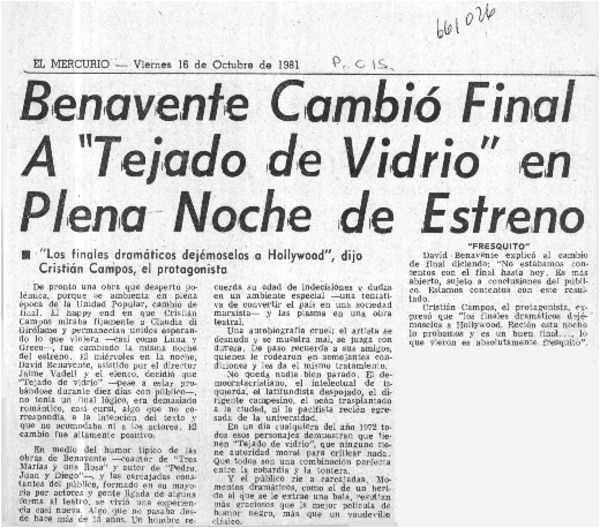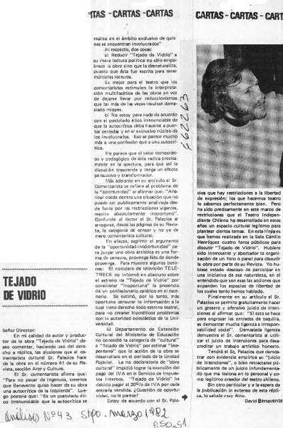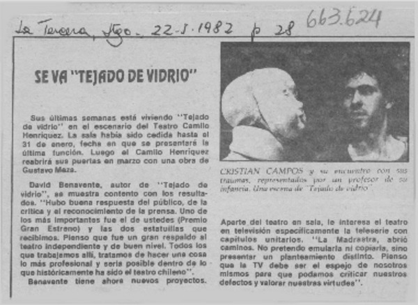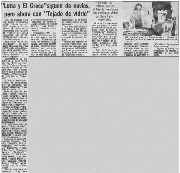 Tejado de vidrio": una obra autobiográfica de D. Benavente : [entrevista] [artículo] María Olga Delpiano.