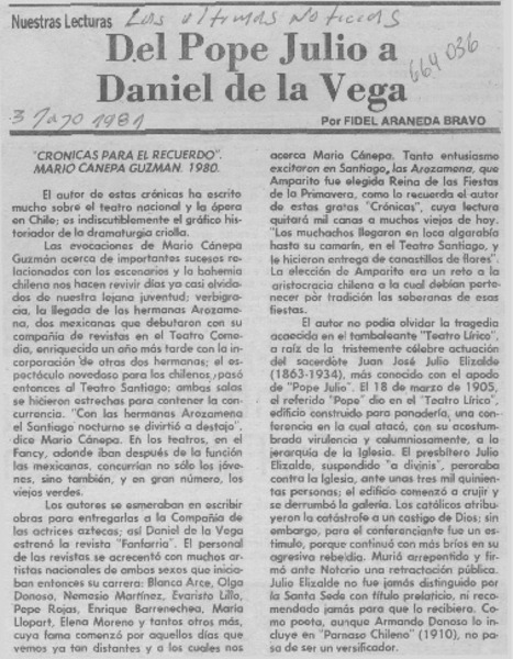 Del Pope Julio a Daniel de la Vega [artículo] Fidel Araneda Bravo.