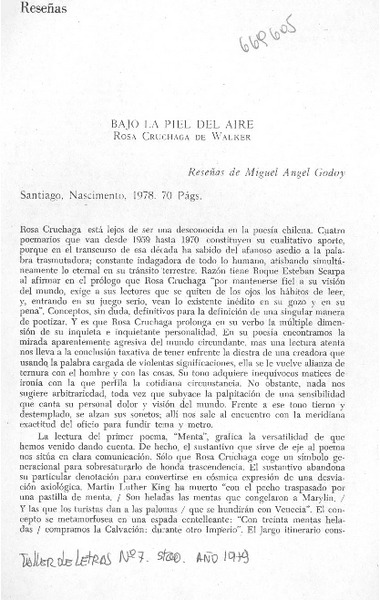 Bajo la piel del aire, de Rosa Cruchaga de Walker [artículo] Luis Vargas Saavedra.