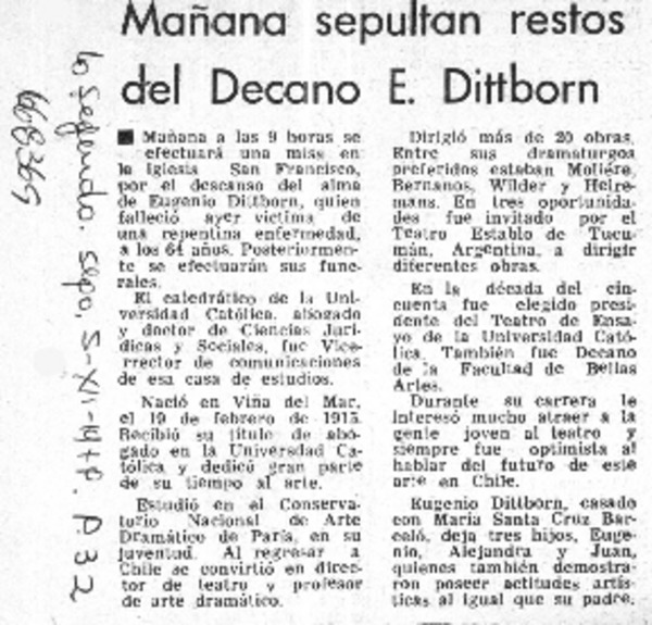 Mañana sepultan restos del decano E. Dittborn. [artículo]