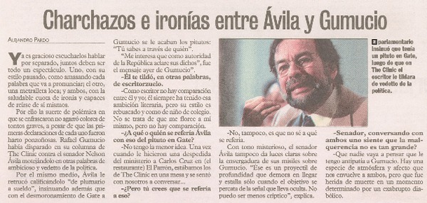 Charchazos e ironías entre Avila y Gumucio : [Entrevista] [artículo] Alejandro Pardo.