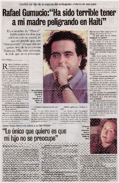 Rafael Gumucio: "Ha sido terrible tener a mi madre peligrando en Haití" [entrevistas] [artículo] : Jorge Núñez.