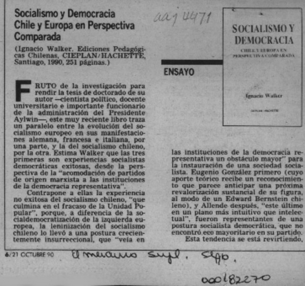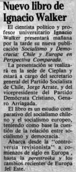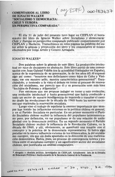 Comentarios al libro de Ignacio Walker "Socialismo y democracia, Chile y Europa en perspectiva comparada" [artículo] Jorge Arrate [y] Genaro Arriagada.