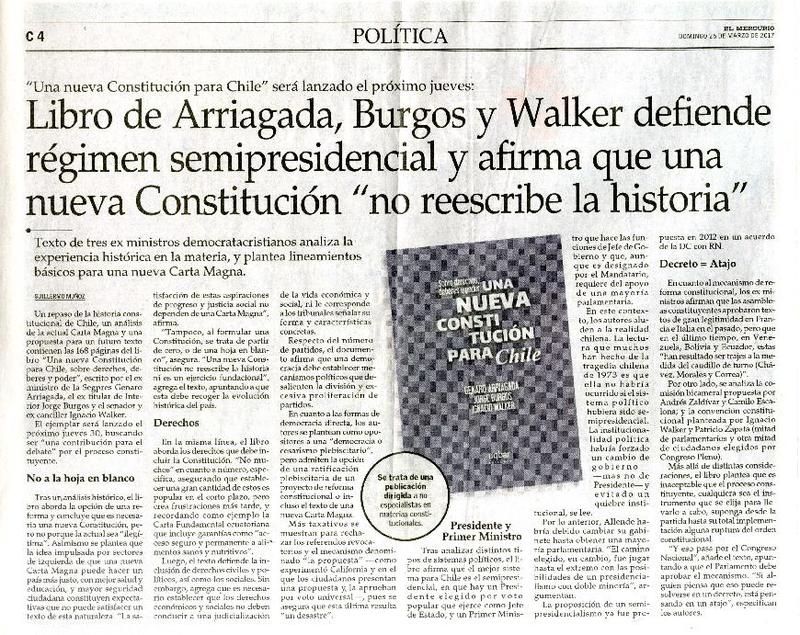 Una nueva Constitución será lanzado el próximo jueves: Libro de Arriagada, Bustos y Walker defiende régimen semipresidencial y afirma que una nueva Constitución "no reescribe la historia" Guillermo Muñoz.