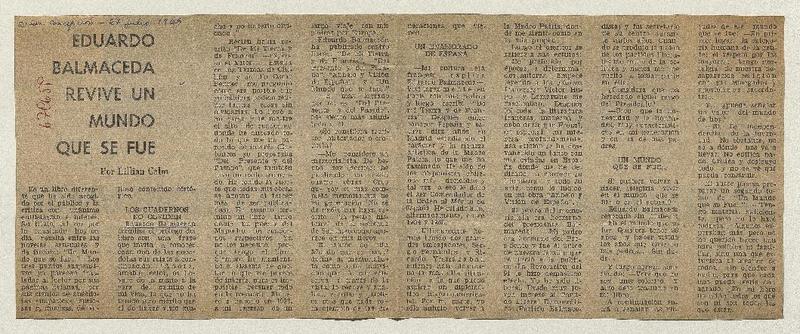 Eduardo Balmaceda revive un mundo que se fué [artículo] Lilian Calm.