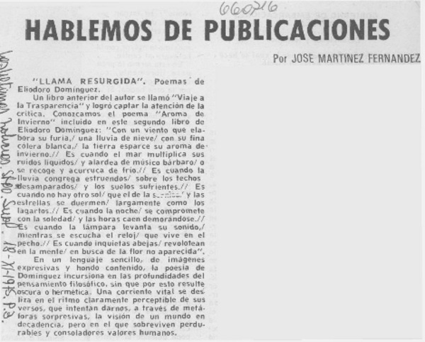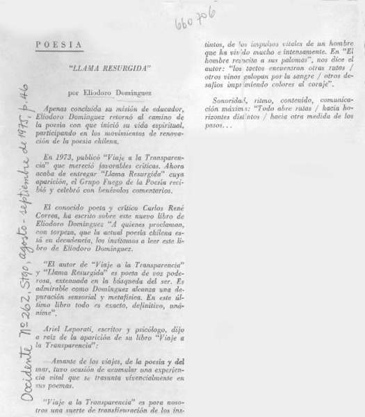 Autores chilenos - Domínguez, Eliodoro - Viaje a la transparencia - "Llama resurgida"