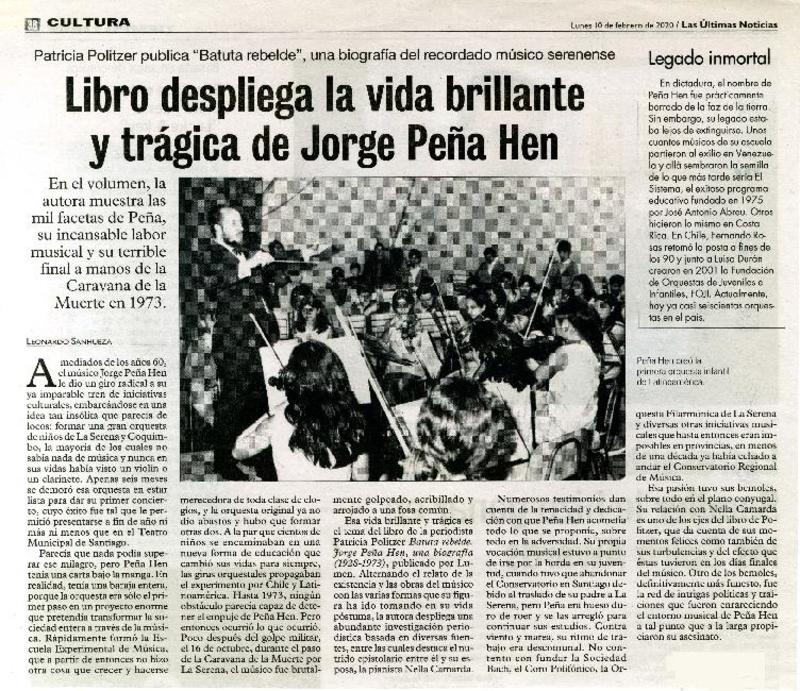 Libro despliega la vida brillante y trágica de Jorge Peña Hen [artículo] Leonardo, Sanhueza.