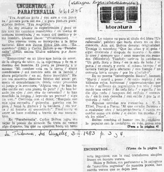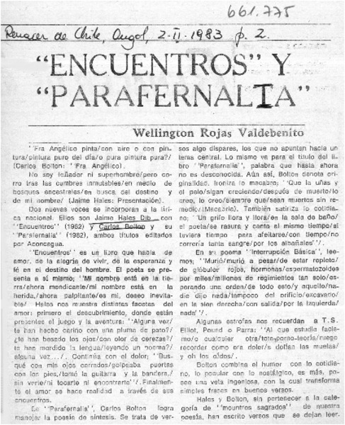 "Encuentros" y "Parafernalia" [artículo] Wellington Rojas Valdebenito.