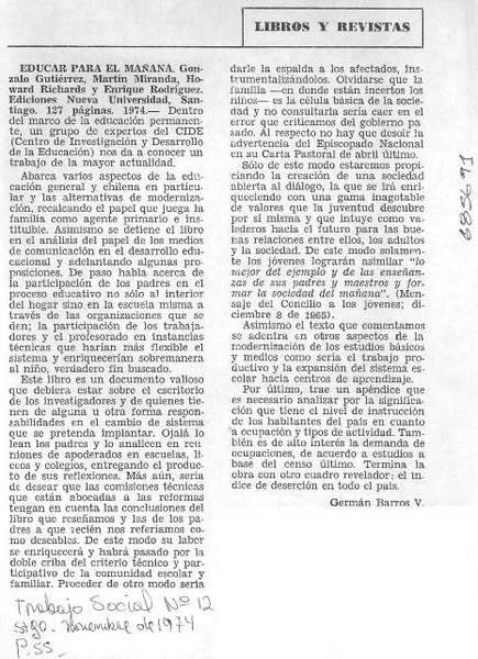 Autores chilenos - Rodríguez, Eugenio - Miranda, Martín - Barros, Germán - Educación de adultos y desarrollo social - Gutierrez, Gonzalo - Educar para el mañana - Richards, Howard