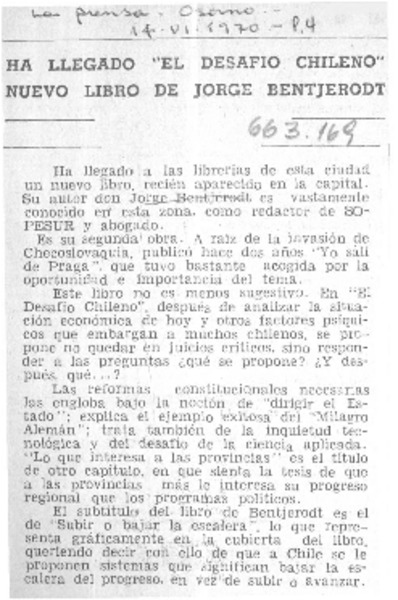 Ha llegado "El desafío chileno" nuevo libro de Jorge Bentjerodt. [artículo]