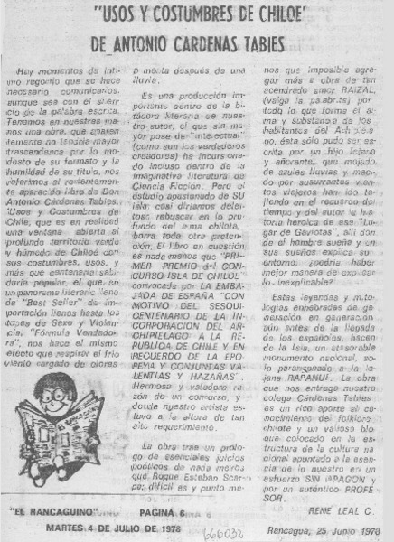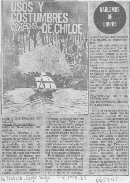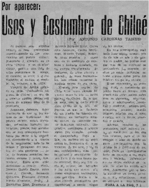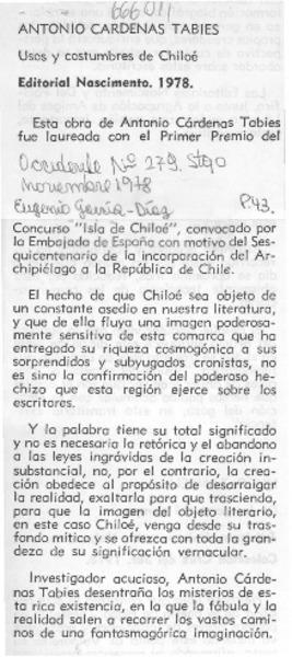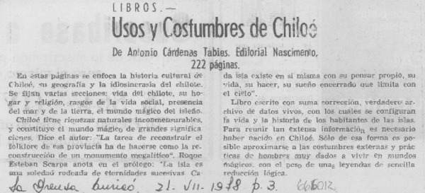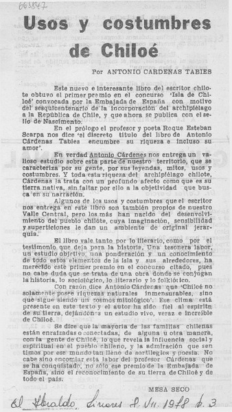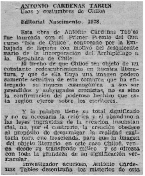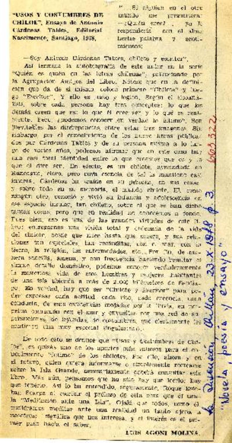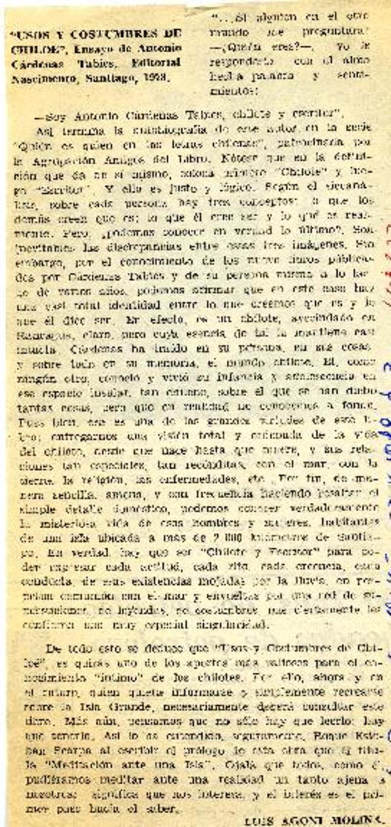 Usos y costumbres de Chiloé ensayo de Antonio Cárdenas Tabies [artículo] Luis Agoni Molina.