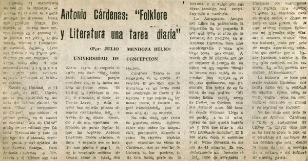 Antonio Cárdenas: "Folklore y literatura una tarea diaria" [artículo] Julio Mendoza Belio.