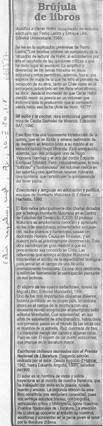 Autores chilenos - Viajero de las cuatro estaciones - Escritores chilenos laureados con el Premio Nacional de Literatura - Emociones y lenguaje en educación y política - Hahn, Óscar - Merino Reyes, Luis - Maturana R., Humberto - Littin, Miguel - Asedios a Oscar Hahn - Mi exilio y la cocina - Bachelet de Miranda, Cecilia