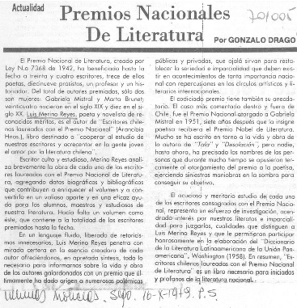 Premios nacionales de literatura [artículo] Gonzalo Drago.