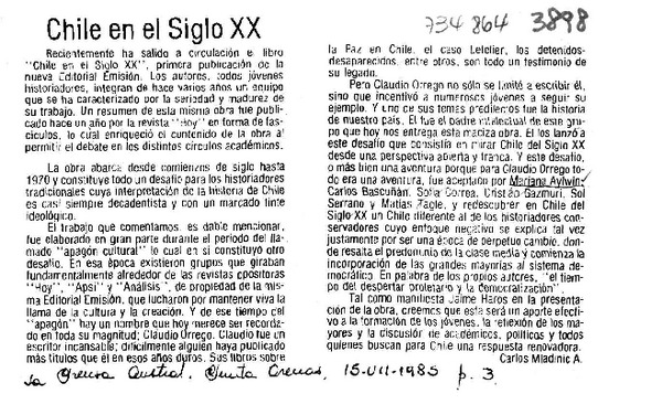 Chile en el siglo XX [artículo] Carlos Mladinic A.