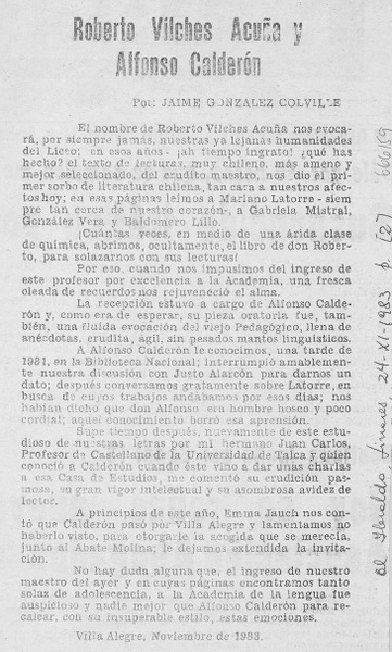 Roberto Vilches Acuña y Alfonso Calderón [artículo] Jaime González Colville.