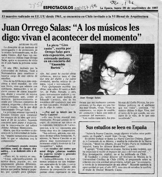 Juan Orrego Salas, "A los músicos les digo, vivan el acontecer del momento" [artículo] Myriam Olate.