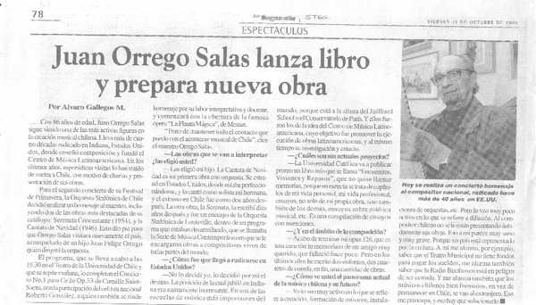 Juan Orrego Salas lanza libro y prepara nueva obra [entrevista] [artículo] / por Alvaro Gallegos M.