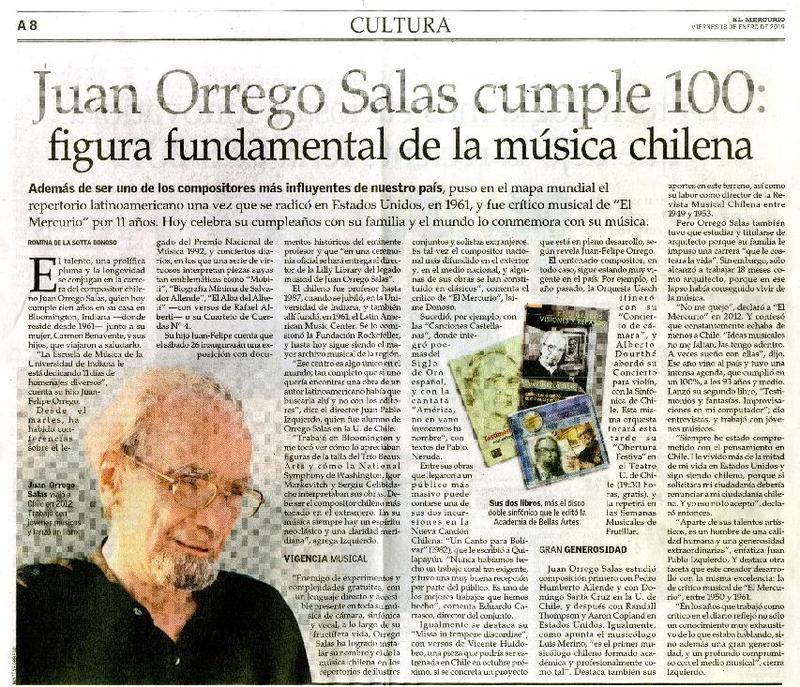 Juan Orrego Salas cumple 100 figura fundamental de la música chilena [artículo] : Romina de la Sotta Donoso.