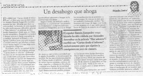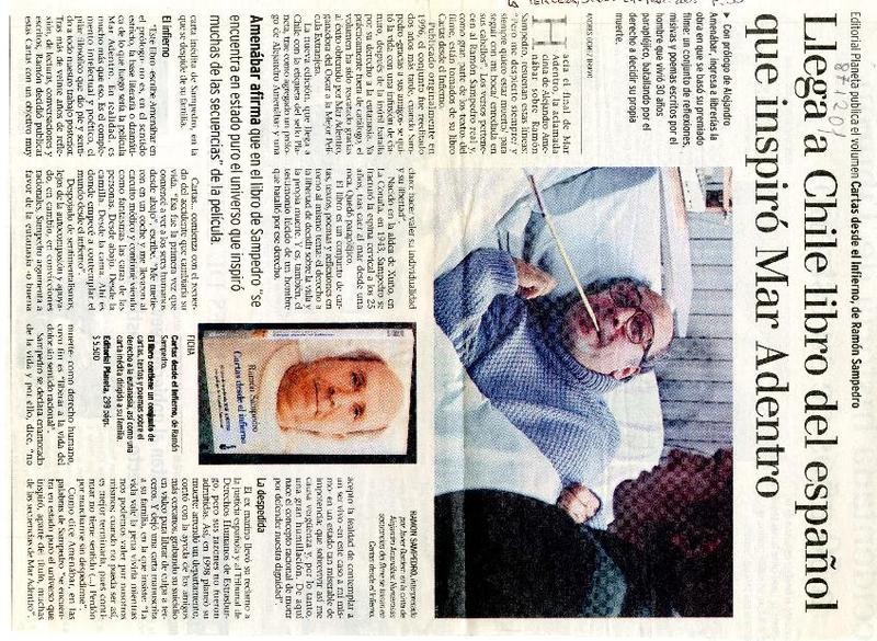 Editorial Planeta publica el volumen Cartas desde el infierno, de Ramón Sampedro : llega a Chile libro que inspiró Mar adentro [artículo] Andrés Gómez Bravo