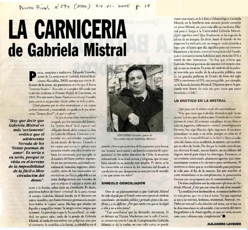 Autoras chilenas - Autores chilenos - Mistral, Gabriela - Entrevistas - Vasallo, Eduardo - Carnicería de Gabriela Mistral