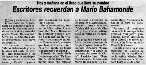Escritores recuerdan a Mario Bahamonde. [artículo]