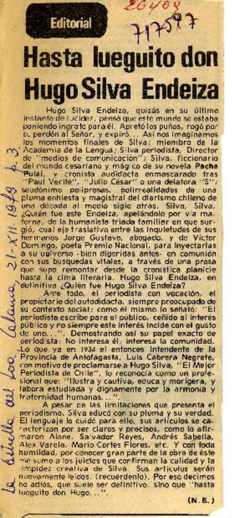 Hasta lueguito don Hugo Silva Enseiza [artículo] N. B.