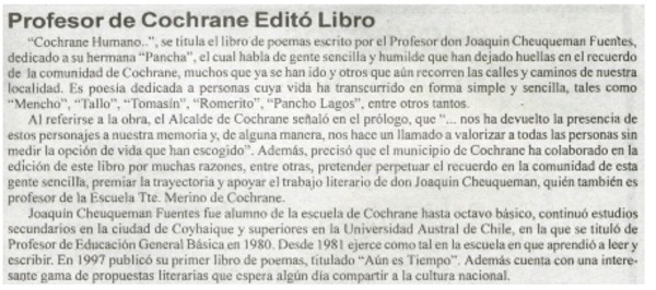 Dan a conocer proyecto literario de Cochrane [artículo].