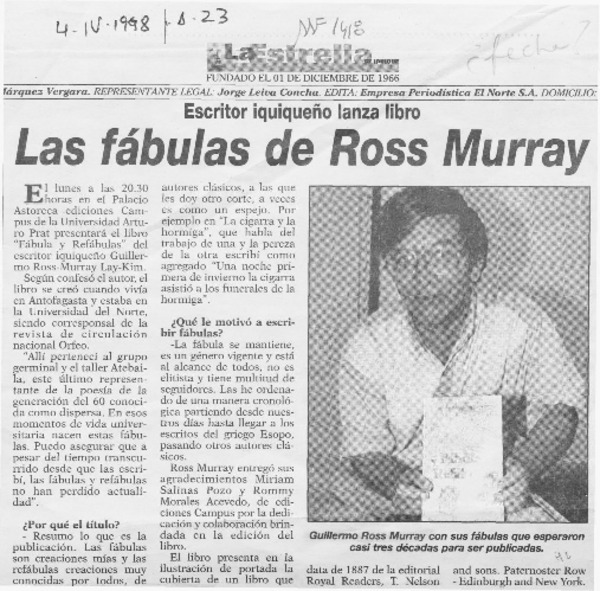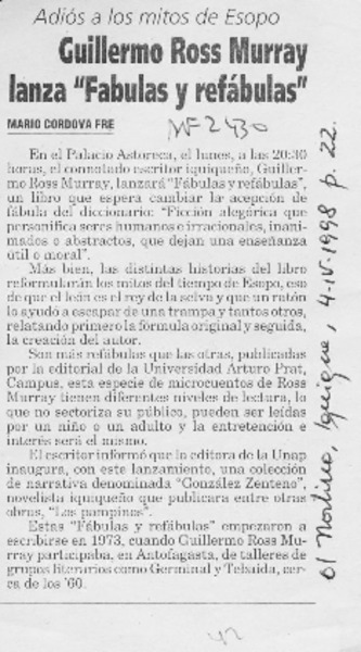 Guillermo Ross Murray lanza "Fábulas y refábulas" [artículo] Mario Córdova Fre.