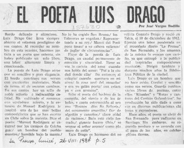 El poeta Luis Drago [artículo] José Vargas Badilla.