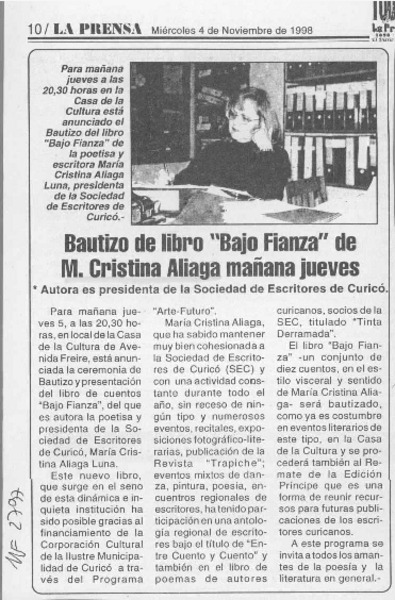 Bautizo de libro "Bajo fianza" de M. Cristiana Aliaga mañana jueves [artículo].