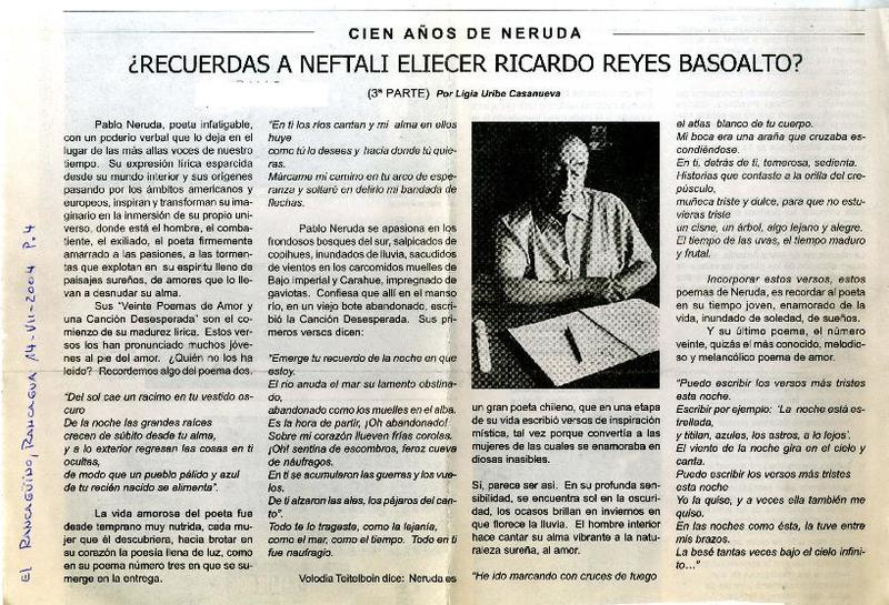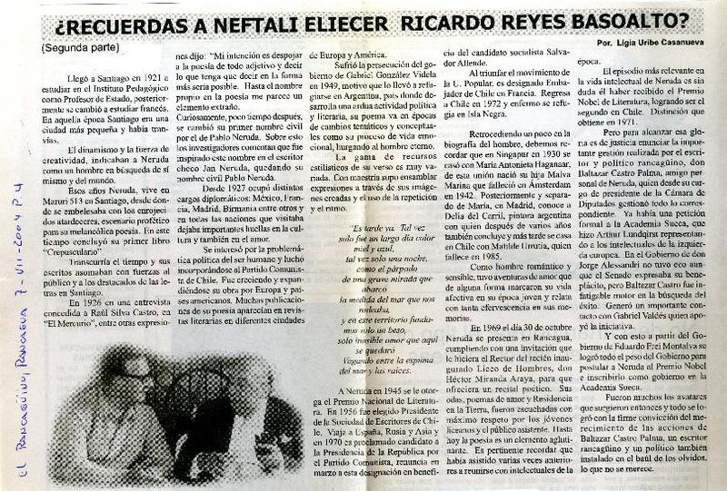Recuerdas a Neftalí Eliecer Ricardo Reyes Basoalto? segunda parte [artículo] : Ligia Uribe Casanueva.