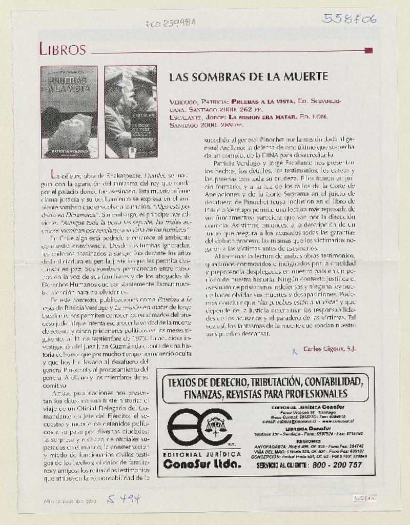 Autores chilenos - Verdugo, Patricia - Escalante, Jorge - mision era matar - Pruevas a la vista