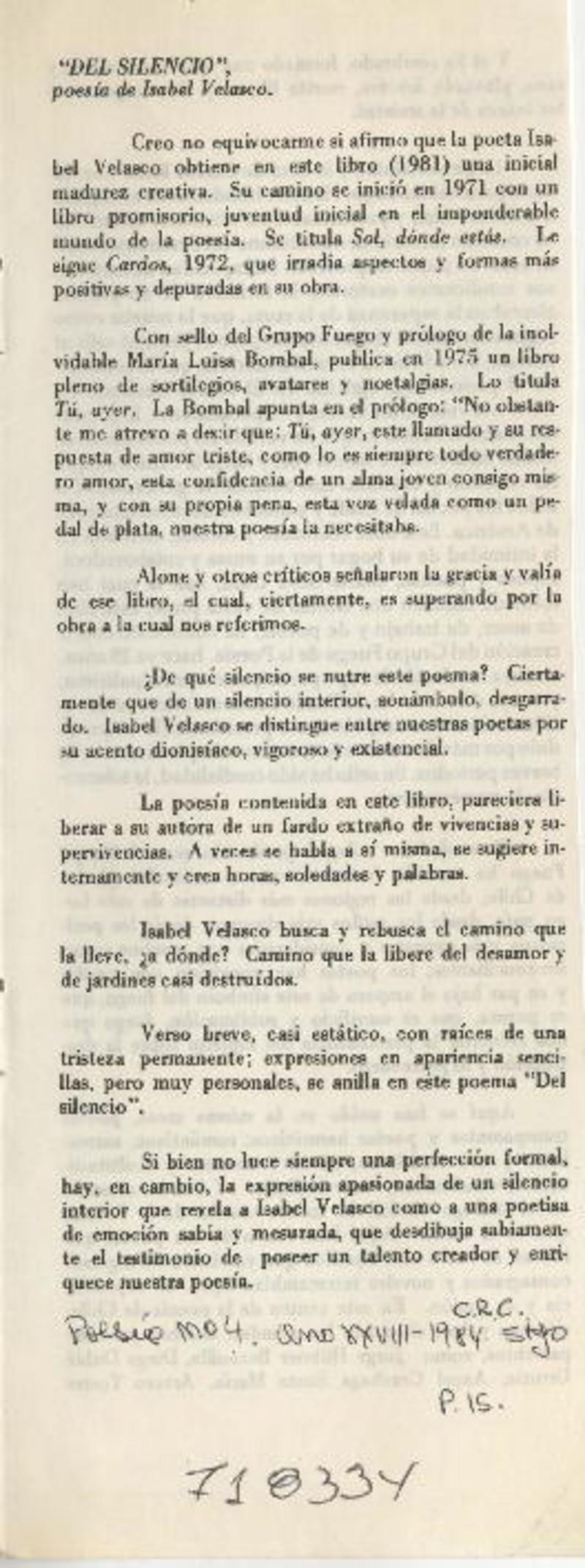 Autoras chilenas - Velasco, Isabel - Del silencio