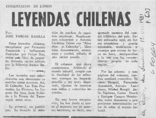 Leyendas chilenas [artículo] José Vargas Badilla.