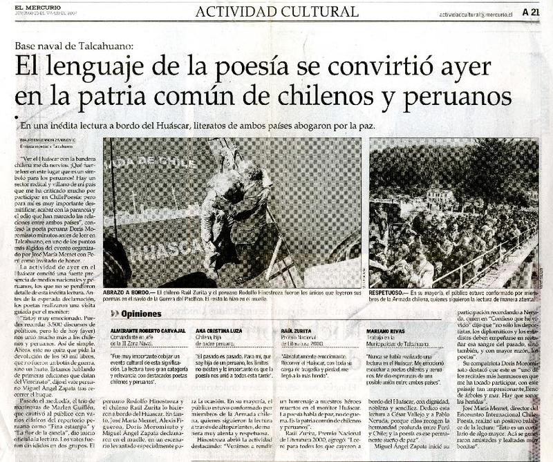 El lenguaje de la poesia se convirtió ayer en la patria común de chilenos y peruanos [artículo] Maureen Lennon Zaninovic.