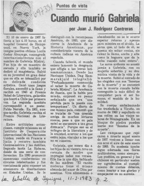 Cuando murió Gabriela [artículo] Juan J. Rodríguez Contreras.